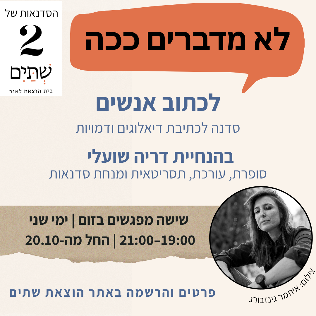 סדנת כתיבה ייחודית בהנחיית דריה שועלי. 6 מפגשים של קריאה מודרכת ותרגילי כתיבה מעשיים, שבעזרתם נלמד איך לכתוב דמויות ודיאלוגים אמינים, שמשרתים את הספר. נלמד להשתמש בדיאלוגים ככלי לאפיון דמויות, לחשיפת מידע והסתרתו, לקידום העלילה ולעיצוב העולם הסיפורי. באווירה מפרה ואינטימית, נקרא, נכתוב, נקבל וניתן משוב, ונצא עם סט כלים חדש וחיוני.